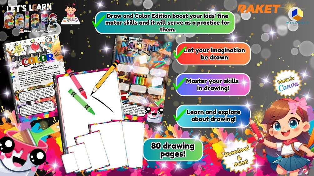 - Let’s Learn Colors: Draw and Color Edition PDF File in A4 Size Formatting (80 printable drawing pages).